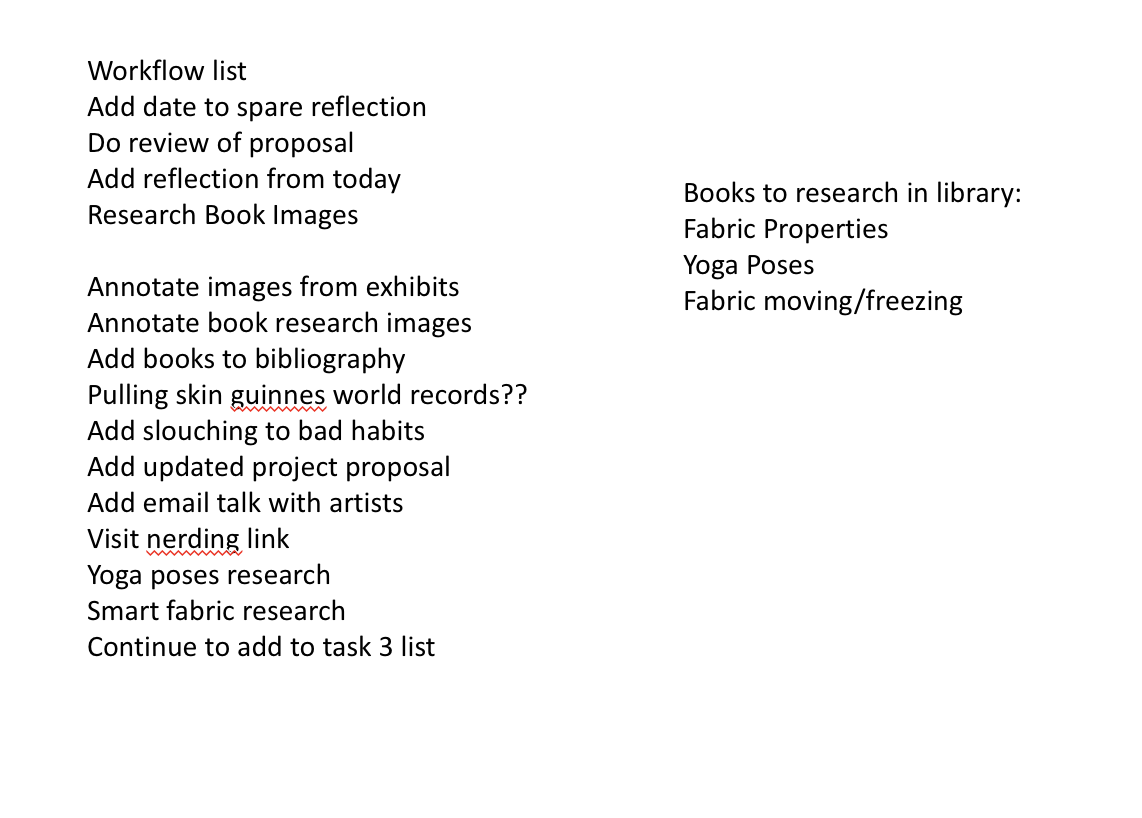 Reflecting on my extended bibliography especially towards the end of unit 7 I have found my bibliography to be really useful in identifying where the main bulk of my research has come from and where I could do more research in that area. Many of the books I read or looked into were all relevant at that time of research; each piece of research I find is a stepping stone to the next area of development. I particularly enjoyed the illustrations in Erwin Wurms books and the 'Posture' book by D Zacharkow; including a lot of imagery on different yoga moves which is what I needed to get my head around this idea of body contortion and improving posture. Leading me on to further books like 'Everyday Ideologies" and 'Yoga for backaches". This led me on to body economics and how posture can be improved when at work by slightly changing the elevation of a chair. Overall its interesting to see my bibliography at the end of unit 7; I do have more website research then books however I think that was mainly from my coding research at the beginning of my project where you could not get many books on this topic. However at the same time I still did a lot of book research and this research in particular was always the most influential in my project. This is because when searching online you must search for something specific however when flicking through a book you often come across research you were not originally looking for.