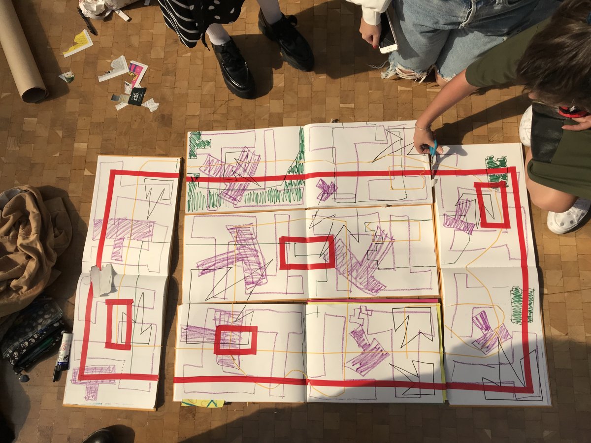 A group task included putting all of our precious sketchbooks together and drawing over all the pages. As I was first to be posing the rest of my group took a different approach to drawing me. Personally I would have focused less on the detail and more on the silhouette/ proportion of the body. This is something I can learn and evolve as I get to know my group more so we can work cohesively together. When re-focusing on our three words we had to draw what came to our minds after each word. For the word concrete I tried to focus on how I could create textures and be more broad about the material except for just grey buildings. On the word fold I took some fabric scraps and squished them under acrylic. I then drew over this acrylic revealing the lines that folds of fabric create. I like working in this way by mixing material, drawing and collage together. Finally, for the word feminist at first I found it difficult to draw what came into my head as it was mostly quotes and words by feminists. To make this word easier for me to visualise and describe on paper I need to do more research into artists, photographers and sculptures inspired by feminists. I had a conversation with the tutor about my outcome idea and whether it made sense; I found this discussion with my group and the tutor really useful as it gave me the confidence and further ideas/ methods to explore. When asked to draw our outcome idea at the end of the day I was really excited because I was inspired from the collage I had done previously.